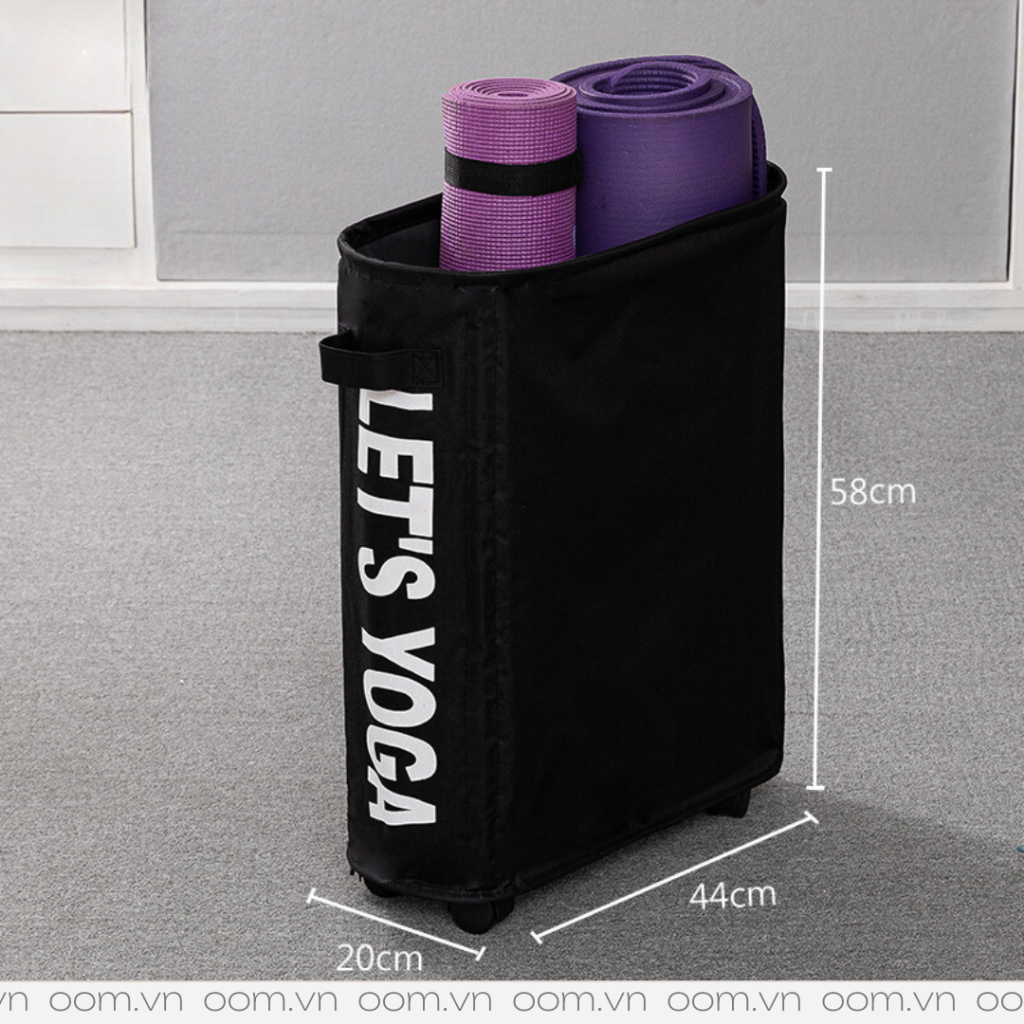 Đã có túi letyoga rồi thì không còn sợ thảm yoga ngã lăn quay giữa nhà nữa. Túi form đứng cứng cáp với bánh xe giúp dễ di chuyển. Ngoài thảm yoga và các dụng cụ thể dục, bạn có thể tận dụng thảm để làm giỏ đựng đồ giặt hoặc đồ dùng linh tinh. Oom có sẵn phiên bản Vani/Black và Pink cho nàng.